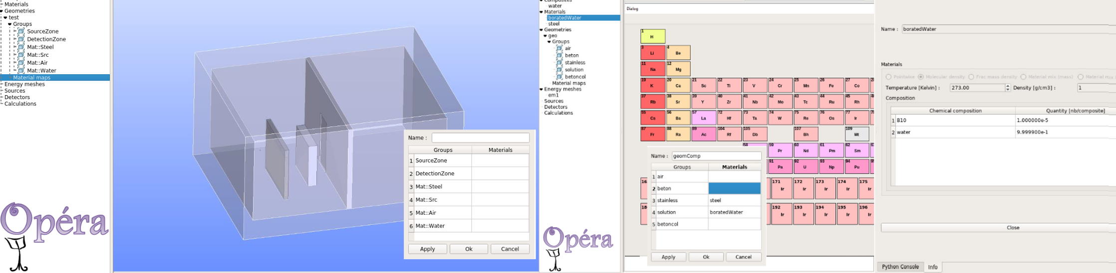 "OPERA", for "Outil Plateforme pour les Études de RAdioprotection", is a computational platform for integrated radiation protection, currently under development at CEA/Direction des Énergies (DES). Its purpose is to offer its users the possibility of defining a complete mutualised description of the parameters necessary for the realisation of a study (geometry, materials, radiation sources, detectors, etc.) and then to choose the calculation method aimed at treating the problem according to its expectations.
