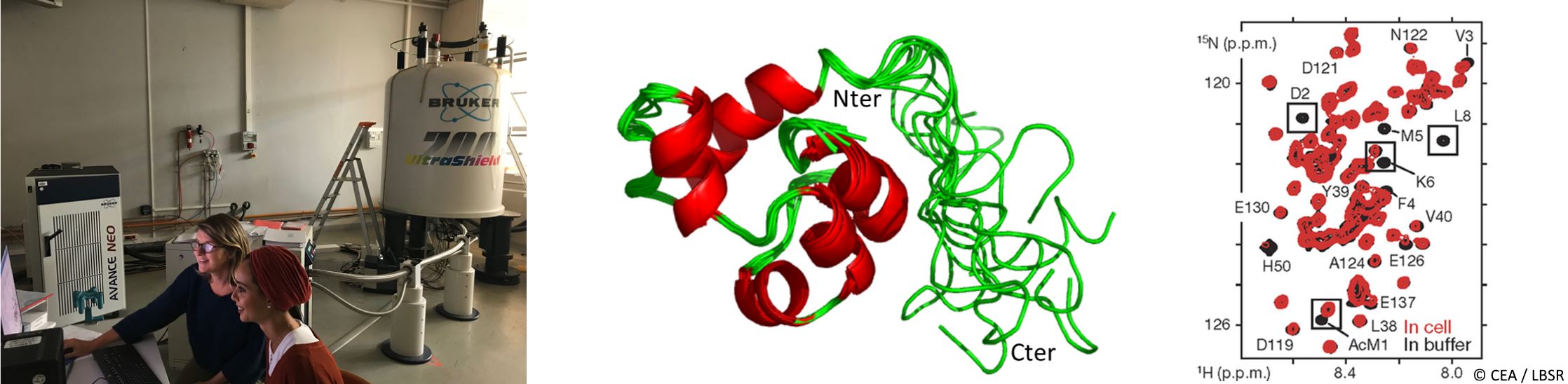 La plateforme de RMN de l'I2BC est spécialisée dans la caractérisation des protéines en solution, qu'elles soient repliées ou désordonnées. Elle s'est en particulier focalisée sur les protéines impliquées dans la signalisation cellulaire, la réparation des dommages de l'ADN et l'organisation du noyau : repliement, dynamique, interactions protéine:protéine et protéine:ligand, décrits à l'échelle atomique que permet d'atteindre cette spectroscopie. La plateforme a aussi développé et exploité une nouvelle approche : l'identification et le suivi cinétique résidu par résidu de modifications post-traductionnelles (PTMs). Cette approche permet d'identifier et de caractériser des modifications multiples voisines ou à motif dégénéré, et peut virtuellement être appliquée à tout type de PTM (plus d'informations : voir Ehlen et al. Nat. Comm. 2020 / Alik et al., Angew. Chem. 2020). Enfin, la plateforme utilise la RMN pour cartographier des interfaces dans le cadre de la conception d'inhibiteurs d'interaction protéine-protéine (plus d'informations : voir Bakail et al. Cell. Chem. Biol. 2019).