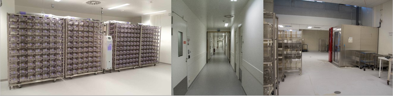 Hébergement : Souris : Env. 3000 cages (5 individus max, en moyenne 3.5 par cage) : Conventionnelle : 1152 cages, EOPS : 1792 cages (IVC), A2 : 96 cages (IVC) ; 40aine : 240 cages (IVC)