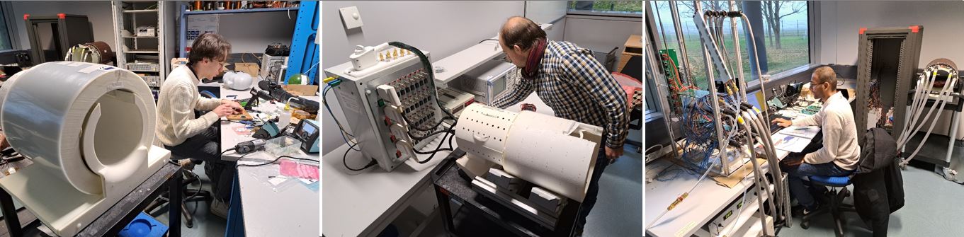 L’atelier d’électronique pour l’IRM, en association avec l’équipe d’Instrumentation IRM, conçoit et développe de nouveaux systèmes électroniques pour l’IRM à haut champ magnétique de NeuroSpin, autour de deux axes de recherche : 1/ les antennes « tête » à multiples éléments de transmission et de réception, pour homogénéiser l’excitation des spins et récupérer un maximum de rapport signal/bruit en un minimum de temps, 2/ des fourreaux de shim dédiés à l’homogénéisation du champ statique dans le cerveau, pour améliorer la qualité de l’imagerie ultra-rapide comme l’imagerie Echo-Planaire couramment utilisée en IRM fonctionnelle ou en IRM de diffusion. Ces thématiques sont développées aussi bien pour l’humain que pour l’animal, selon les besoins.